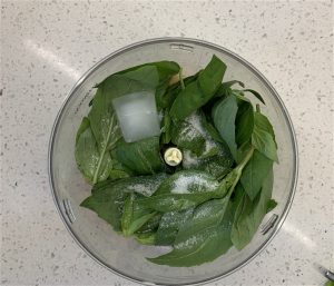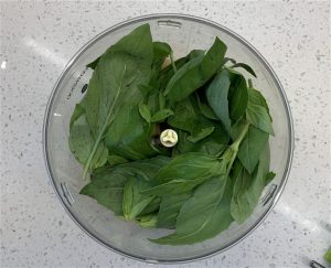 Basil – One of my favourite scents in the world – fresh basil. There’s nothing like it. Of course, you can add more or less than I’ve recommended depending on your preference. Remember the more you add, the more of a green hue your hummus will have.