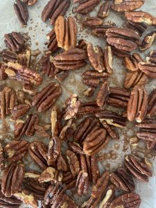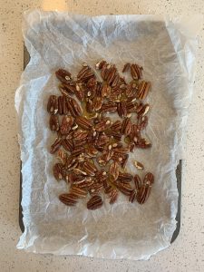 • On a baking tray, coat your pecans in maple syrup, and get these in the oven for 10 minutes, turning halfway through. Once roasted, take them out of the oven and put the tray to the side to cool.