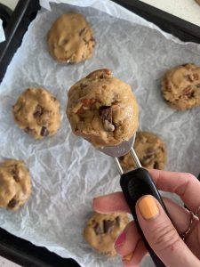 At around 30-45 minutes later, collect your dough from the fridge and get that scoop ready! Using an ice cream scoop is a great way to ensure that your cookies come out of equal size and proportions – which means an even bake. But fear not, if you don’t have a scoop, you can use a regular teaspoon. If you’re extra fancy you can weigh your dough! But I’ll admit I’ve never done this (life’s too short). Aim for around 6 cookies per tray. This allows them the space to spread if they so wish.