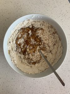 Next up, we’re combining our dry ingredients. That’s the flour, bicarb (baking soda to my American friends) and salt. I like to use a balloon whisk to combine these to ensure it’s all thoroughly blended together.