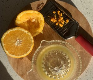 Orange – the star of the show! Valencia and Navel oranges are said to be the best for flavour and juice, but really, anything here will work. Look for a large, round orange that has a slightly sweet smell. Of course, always be careful to check that it is unwaxed. This is especially important as we will be zesting the orange.